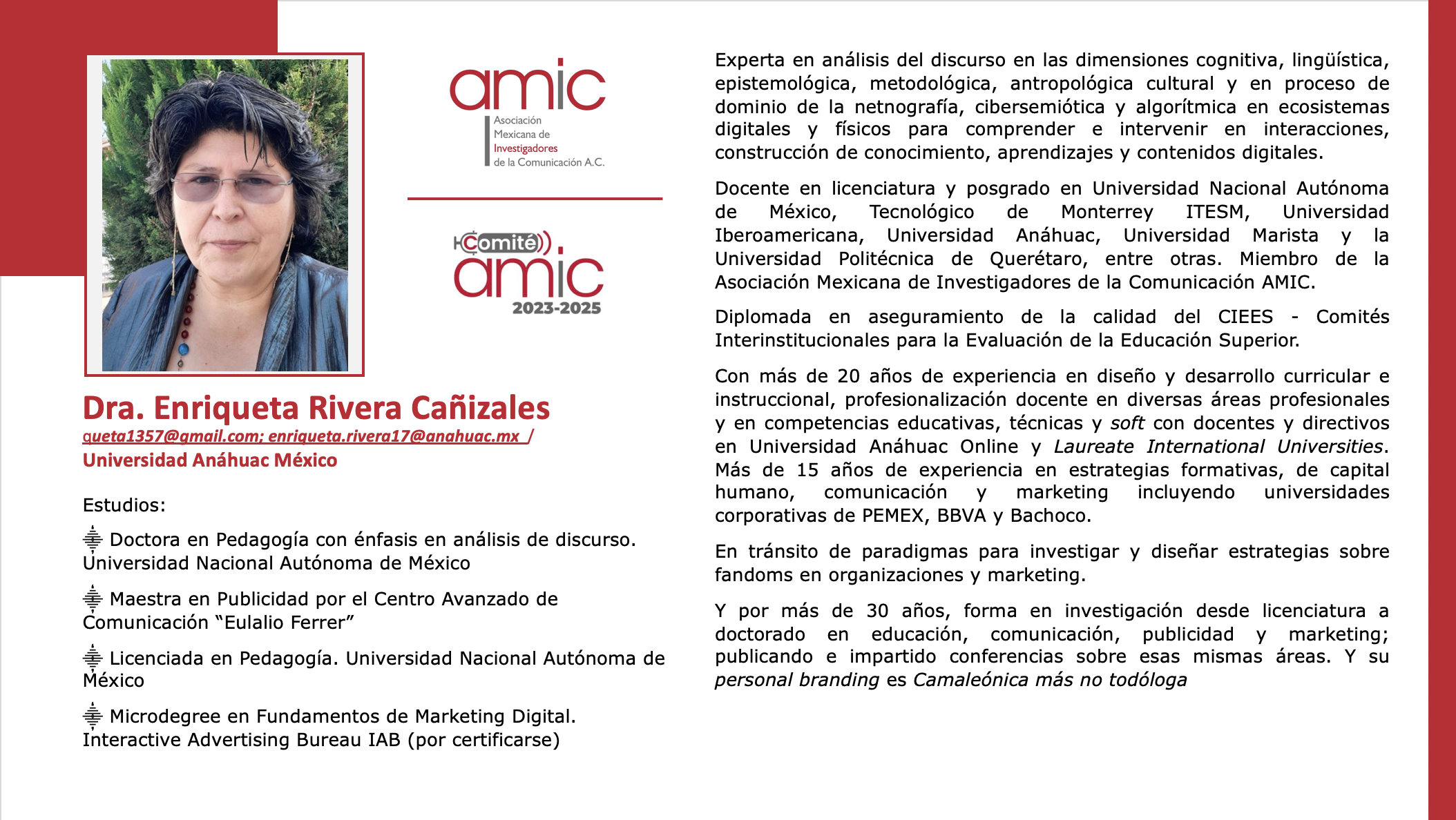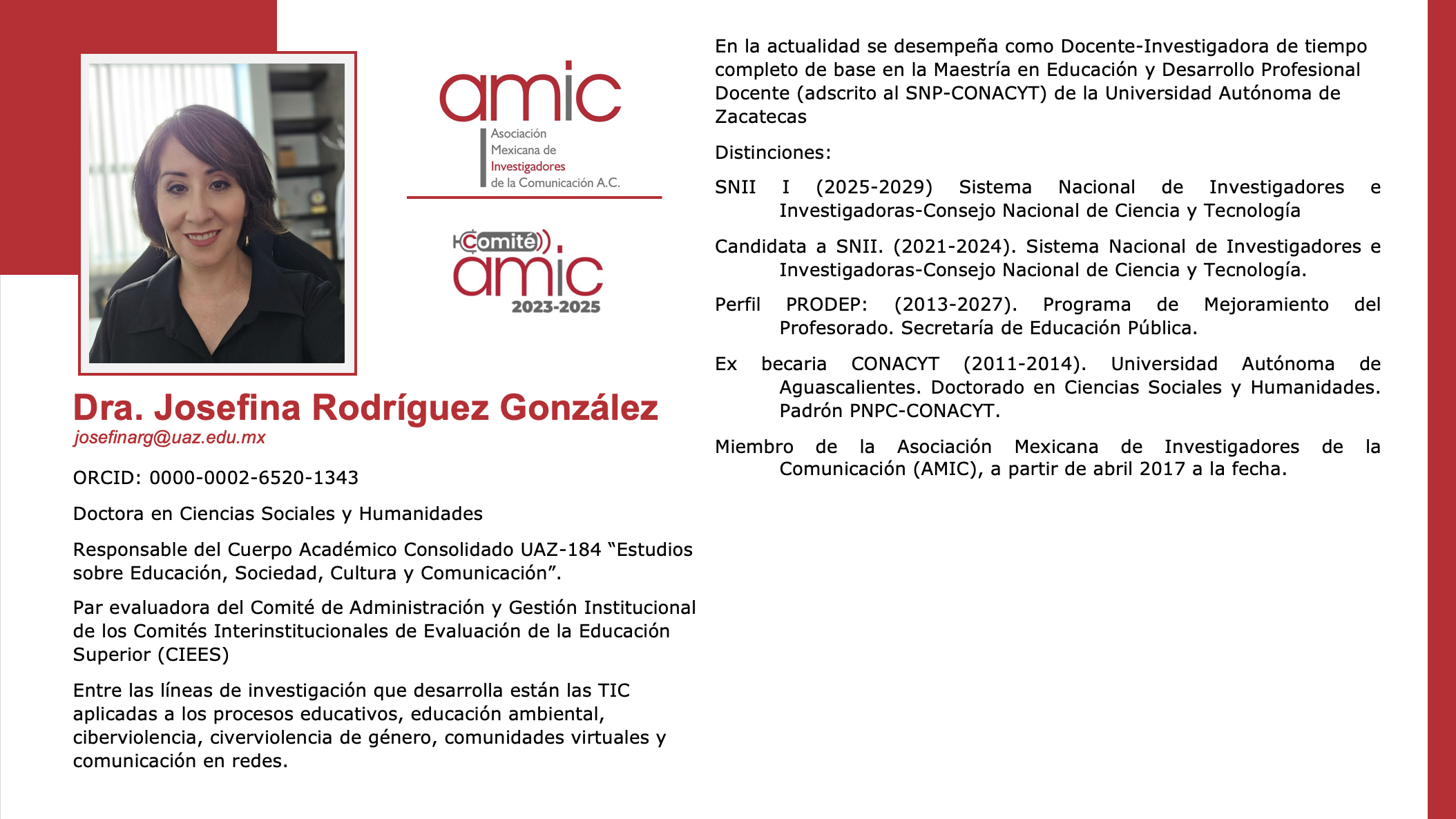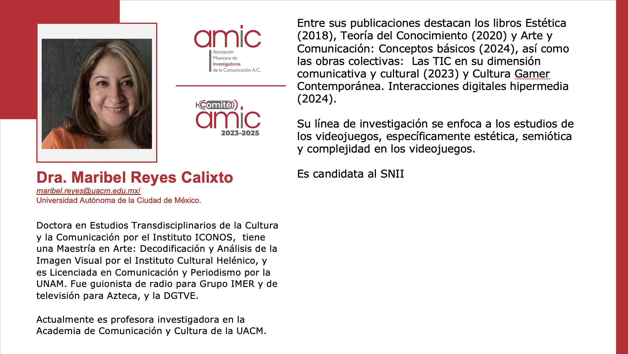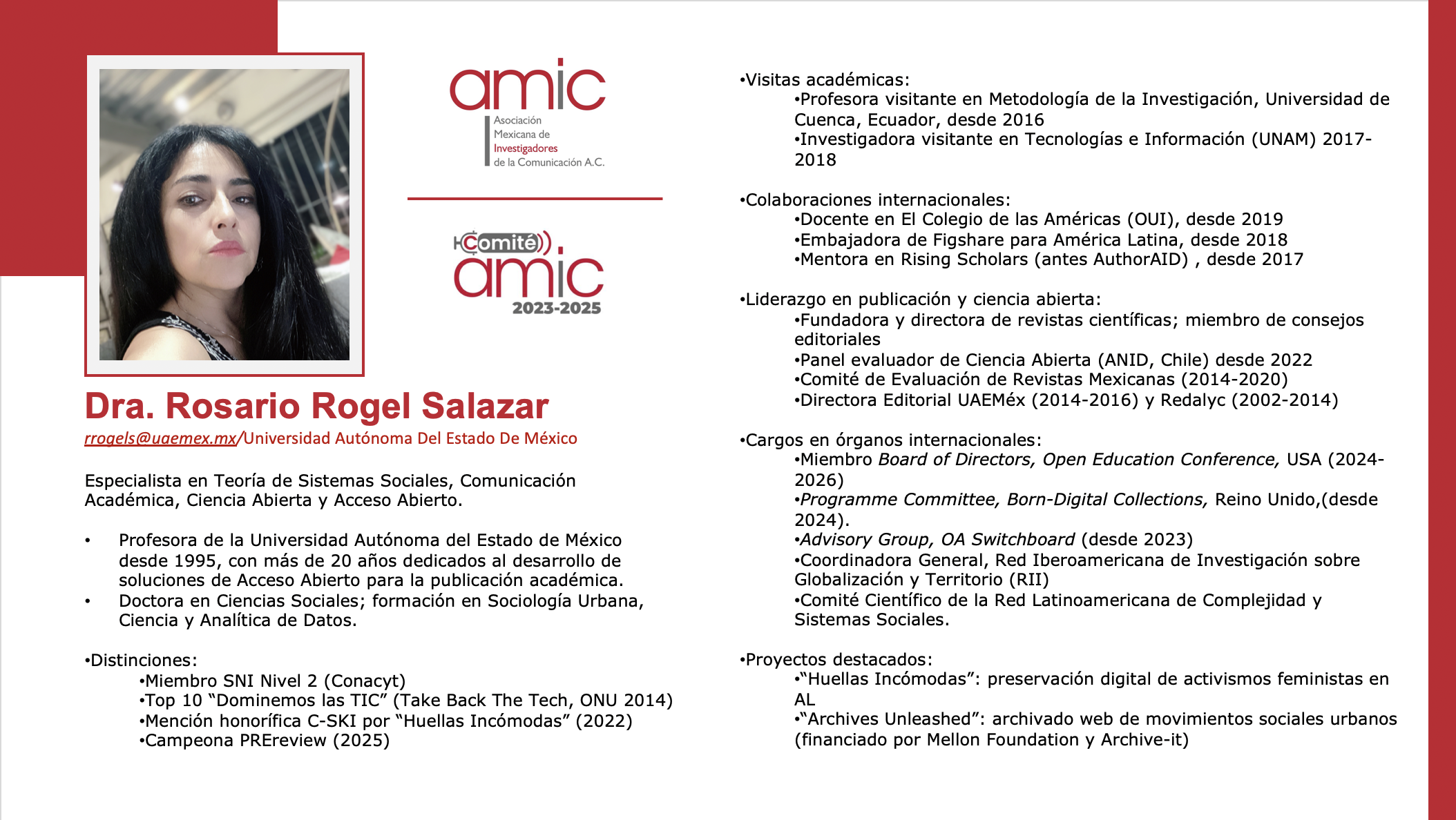Presidenta de AMIC, Dra. Lizy Navarro Zamora: lizy@uaslp.mx